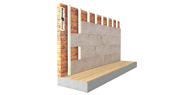 External counter-wall system with BetonWood on wood which consists in BetonWood cement bonded particle boards fixed on wood wall; complete supply of installation accessories.![]()