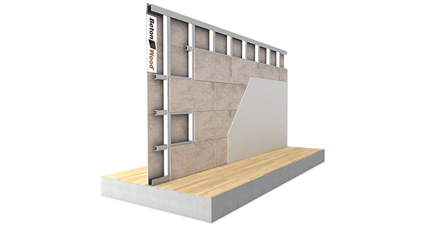 Sistema per controparete interna in BetonWood caratterizzata da pannelli in cementolegno lasciati a vista e fissati su telaio metallico.![]()